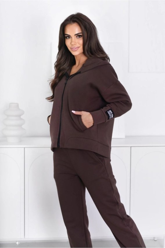Postaw na połączenie wygody i nowoczesnego designu! Ta damska bluza rozpinana została wykonana z wysokogatunkowej, grubej bawełny drapanej, która zachwyca miękkością i komfortem noszenia. Delikatny meszek od wewnątrz zapewnia przyjemne uczucie ciepła, dzięki czemu bluza świetnie sprawdzi się podczas chłodniejszych dni, spacerów czy codziennych aktywności. Model wyposażono w praktyczny kaptur i dwie pojemne kieszenie, które pomieszczą najważniejsze drobiazgi. Na lewym rękawie znajduje się czarna, ozdobna naszywka, dodająca sportowego i nowoczesnego charakteru. Elastyczny dodatek elastanu sprawia, że bluza doskonale dopasowuje się do sylwetki, nie ograniczając ruchów. To idealna propozycja dla kobiet ceniących swobodę, funkcjonalność i stylowy, sportowy look — na co dzień, do pracy lub weekendowy wypad.