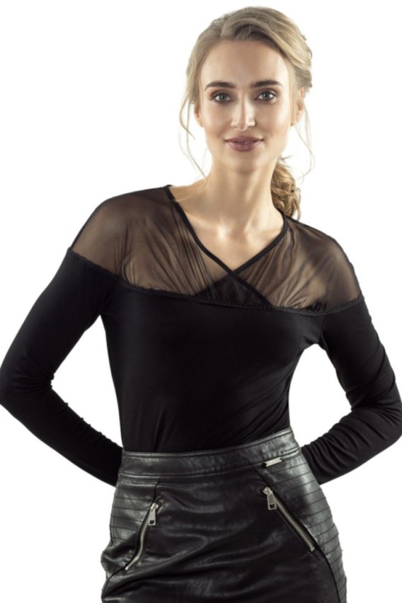 Wyjątkowa bluzka z dekoltem a'la hiszpanka. Pokryta jest tiulem nachodzącym na siebie kopertowo nad biustem.