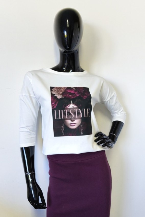 Stylowa bluzka damska z rękawem 3/4 to połączenie wygody i nowoczesnego designu. Wykonana z wysokiej jakości dzianiny (95% bawełna, 5% elastan), jest miękka, elastyczna i przyjemna w dotyku. Dłuższy, zaokrąglony tył dodaje jej ciekawego wyglądu. Na przodzie znajduje się modny nadruk, który nadaje całości oryginalnego charakteru. Doskonała na co dzień, do pracy lub spotkania ze znajomymi.
