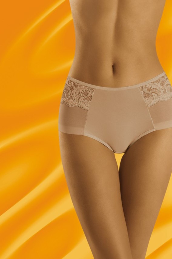 Figi pełne, zabudowane, bogato zdobione koronką. Tył z tiulu typu „clean cut” z bezszwowym wykończeniem nie odznaczającym się pod ubraniem.