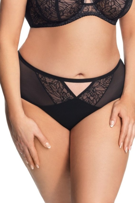 Figi pełne, wykonane z cienkiej microfibry. Przód ozdobiony wstawką z przezroczystego tiulu i plenu koronkowego. Dół obszyty cienką taśmą elastyczną. Tył gładki, ozdobiony trójkątem z koronki, wykończony na płasko podwiniętą microfibrą.