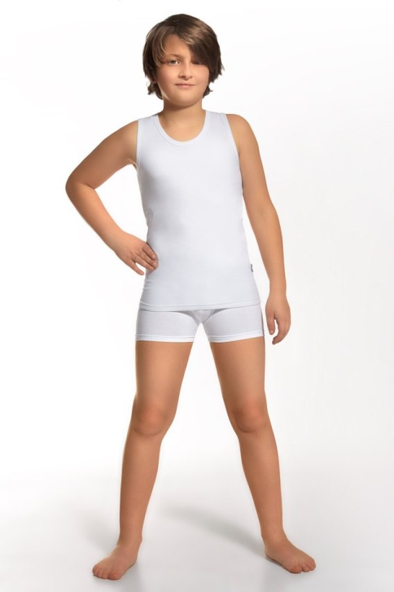 Wygodny i komfortowy komplet komunijny - chłopięcy, z bawełny i elastanu 5%. Koszulka na szerokim ramiączku, bokserki idealnie dopasowane do ciała.
