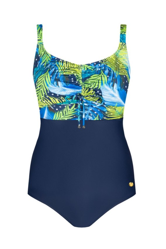 Kostium kąpielowy CORFU 3 S684V1CR3 marki SELF to idealna propozycja dla kobiet ceniących styl, komfort i solidne podtrzymanie biustu – szczególnie w większych rozmiarach (Max Sizes). Usztywniane miseczki z fiszbinami zapewniają odpowiednie modelowanie i podparcie, a regulowane ramiączka umożliwiają indywidualne dopasowanie. Góra stroju przyciąga wzrok kolorowym tropikalnym printem, który kontrastuje z jednolicie granatowym dołem, optycznie wysmuklając sylwetkę. Wysokiej jakości mikrofibra jest odporna na chlor, co czyni ten kostium idealnym nie tylko na plażę, ale także do intensywnego użytkowania na basenie.