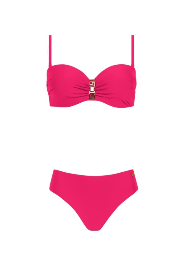 Elegancki, dwuczęściowy kostium kąpielowy z lini Gold. Wykonany z wysokogatunkowej, jednolitej mikrofibry z dodatkiem lycry. Biustonosz usztywniany, typu bardotka, z fiszbinami. Miseczki przy karczku marszczone, ozdobione klamrą. Zapinany na plecach, ramiączka z regulacją, odpinane. Figi gładkie, wycięte na pośladkach