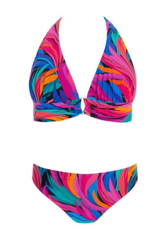 Cechą charakterystyczną tego stroju jest wiązanie na szyi, które pięknie eksponuje ramiona i dekolt, dodając całości lekkości i kobiecego uroku. Regulowane ramiączka z mikrofibry są przyjemne w dotyku i zapewniają idealne dopasowanie. Konstrukcja z usztywnianymi miseczkami delikatnie modeluje biust, zapewniając jego stabilność nawet podczas pływania.