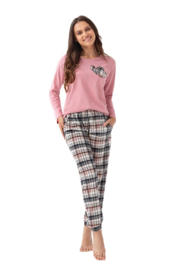 Górę zestawu stanowi bluzka z długim rękawem w odcieniu pudrowego różu, ozdobiona aplikacją w kształcie dwóch serc w kratę, która nadaje całości romantyczny akcent. Do kompletu dołączone są długie spodnie w kratę z praktycznymi kieszeniami i nogawkami zakończonymi elastyczną gumką, które zapewniają komfort cieplny i dobre dopasowanie.