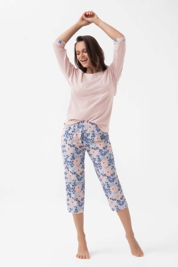 Piżama damska Luna 343 J/25 to połączenie klasyki i nowoczesnego wzornictwa. Góra w jednolitym kolorze (wrzosowym lub kremowym) ma półokrągły dekolt i rękawy 3/4 z mankietami wykonanymi z drukowanej dzianiny, które nawiązują do wzoru spodni. Spodnie o długości 3/4 są również drukowane, co nadaje całości harmonijnego wyglądu. Komplet wykonany w 100% z bawełny gwarantuje naturalną przewiewność i wysoki komfort snu. Idealna na każdą porę roku.