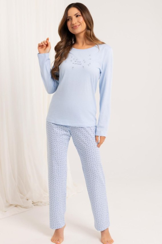 Piżama damska 708 BIG J/25 to doskonały wybór dla kobiet ceniących wygodę i subtelny styl. Zestaw został uszyty z wysokiej jakości, 100% bawełny, która jest miękka, przewiewna i przyjazna dla skóry. Góra kompletu to klasyczna koszulka z długim rękawem, półokrągłym dekoltem i nadrukiem na przodzie. Całość uzupełniają wzorzyste, długie spodnie o luźnym kroju, które zapewniają swobodę ruchów i komfort przez całą noc.