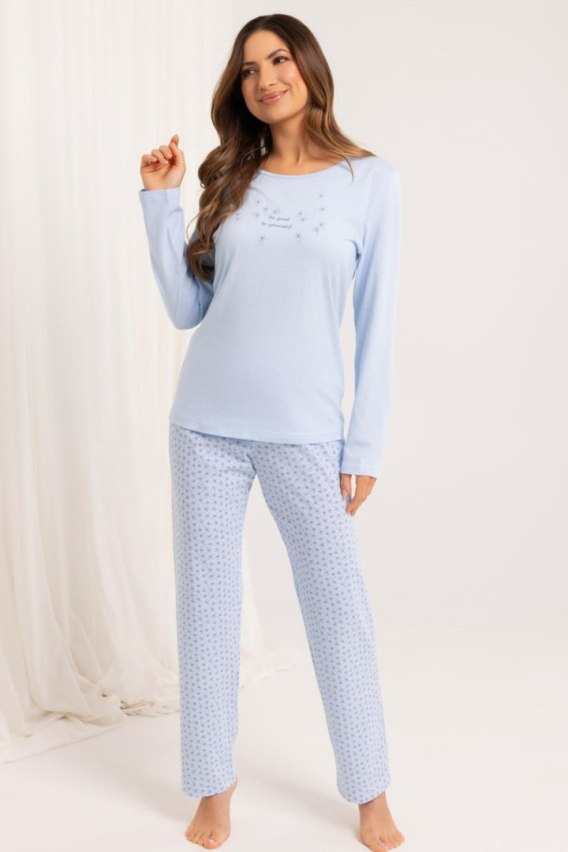Piżama damska 708 J/25 to doskonały wybór dla kobiet ceniących wygodę i subtelny styl. Zestaw został uszyty z wysokiej jakości, 100% bawełny, która jest miękka, przewiewna i przyjazna dla skóry. Góra kompletu to klasyczna koszulka z długim rękawem, półokrągłym dekoltem i nadrukiem na przodzie. Całość uzupełniają wzorzyste, długie spodnie o luźnym kroju, które zapewniają swobodę ruchów i komfort przez całą noc.