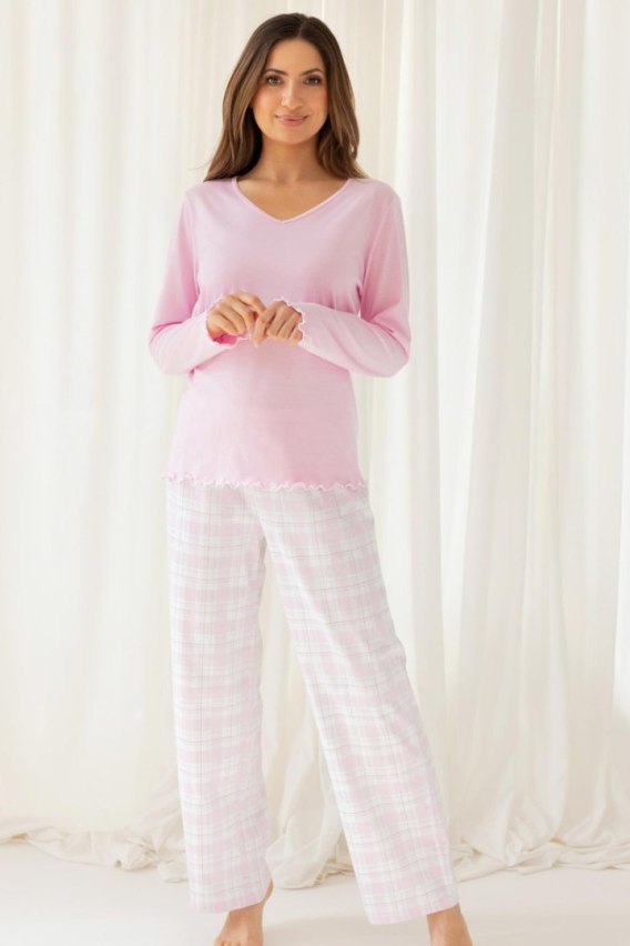 Piżama damska 712 J/25 to połączenie klasycznego kroju z kobiecymi detalami. Wykonana z wysokiej jakości, 100% bawełny, zapewnia pełen komfort i oddychalność przez całą noc. Jednolita koszulka z długim rękawem wyróżnia się dekoltem w szpic oraz subtelnym, falowanym wykończeniem rękawów i dołu bluzki, które nadają całości delikatnego, kobiecego charakteru. Spodnie w modną kratkę z elastyczną gumką obszytą bawełną idealnie dopasowują się do sylwetki, oferując wygodę i swobodę ruchów.