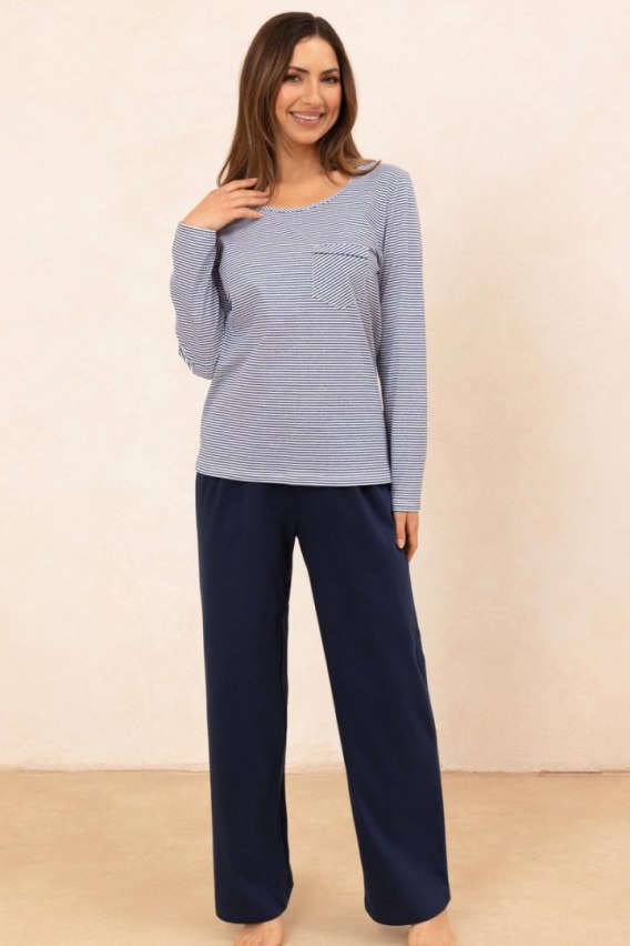 Piżama damska 715 J/25 to klasyczny zestaw nocny wykonany z wysokiej jakości, 100% bawełny. Koszulka w ponadczasowe paski z długim rękawem i okrągłym dekoltem zapewnia komfort i swobodę noszenia. Dodatkowa kieszonka na wysokości piersi dodaje jej uroku i funkcjonalności. Do kompletu dołączone są długie, jednolite spodnie z elastyczną gumką w pasie obszytą bawełną, co gwarantuje wygodne dopasowanie bez ucisku. Naturalny materiał sprawia, że zestaw idealnie nadaje się do spania i wieczornego relaksu w domu.