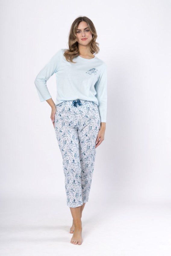 Piżama damska BOGUSIA 1639 marki Leveza to idealna propozycja na spokojne noce i wygodne poranki. Wykonana w 100% z miękkiej, oddychającej bawełny, zapewnia komfort przez cały rok. Górna część piżamy to bluzka z okrągłym dekoltem, rękawem o długości 7/8 oraz uroczym nadrukiem ptaszka. Dodatkową funkcjonalność zapewnia praktyczna kieszeń, a pastelowy odcień baby blue dodaje lekkości i kobiecego uroku. Do kompletu dołączone są spodnie 7/8 w kolorze biało-morskim z motywem ptaków i ozdobną kokardką w pasie. Dostępna w rozmiarach M–2XL.