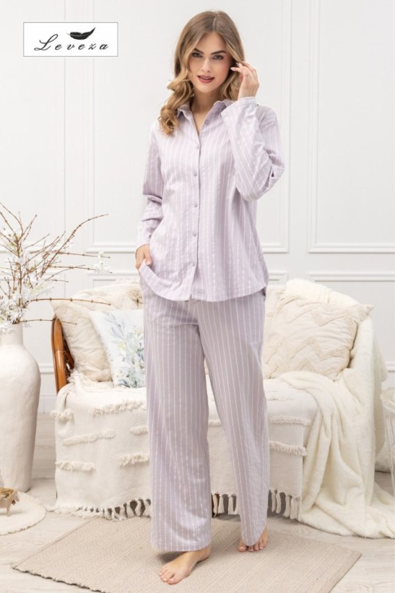 Piżama damska LEVEZA JUDYTA 1613 to elegancki komplet do spania, który łączy kobiecy styl z najwyższym komfortem. Wykonana w 100% z naturalnej bawełny, zapewnia oddychalność i wygodę przez całą noc. Górę stanowi bluzka z długim rękawem i kołnierzykiem ze stójką, utrzymana w delikatnym, liliowym kolorze z pionowym paskiem. Spodnie z długą, szeroką nogawką mają praktyczne kieszenie oraz ozdobny troczek w pasie. Idealna na chłodniejsze noce i relaks w domowym zaciszu. Dostępna w rozmiarach M–2XL.