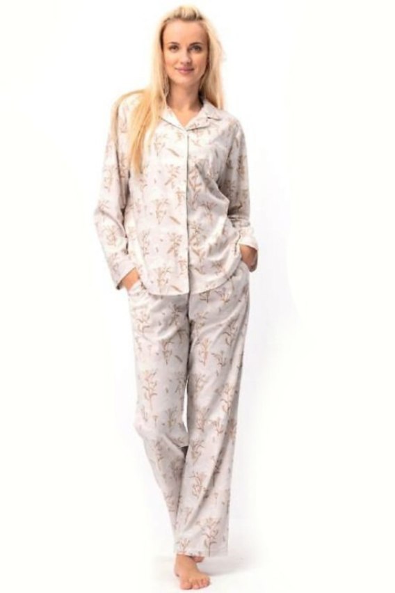 Piżama damska LNS 567 B25 to stylowy komplet, który łączy wygodę z elegancją. Wykonana z wysokiej jakości, miękkiej tkaniny poliestrowej, jest delikatna w dotyku i zapewnia komfort podczas snu i domowego relaksu. Górę zestawu stanowi bluza z długim rękawem, zapinana na guziki, z klasycznym kołnierzykiem, ozdobiona modnym roślinnym printem. Spodnie o długich nogawkach wyposażono w praktyczne kieszenie na biodrach, co podnosi funkcjonalność i wygodę noszenia. Piżama pakowana jest w estetyczne pudełko, dzięki czemu doskonale nadaje się również na prezent.