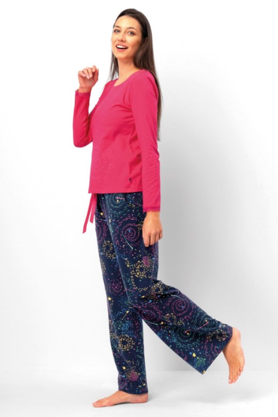 Ta piżama damska to idealne połączenie komfortu, funkcjonalności i energetycznego wyglądu. Górna część w intensywnym, różowym kolorze ma długi rękaw, subtelne zdobienia na mankietach i delikatny nadruk na przodzie, dodający całości uroku. Spodnie z miękkiej, przyjemnej w dotyku tkaniny w granatowej tonacji ozdobiono fantazyjnym, kolorowym wzorem przypominającym rozgwieżdżone niebo lub abstrakcyjne spirale. Luźny krój i elastyczny pas gwarantują pełną swobodę ruchów i wygodę podczas snu. To doskonały wybór dla kobiet, które chcą czuć się stylowo i komfortowo w domowych warunkach.