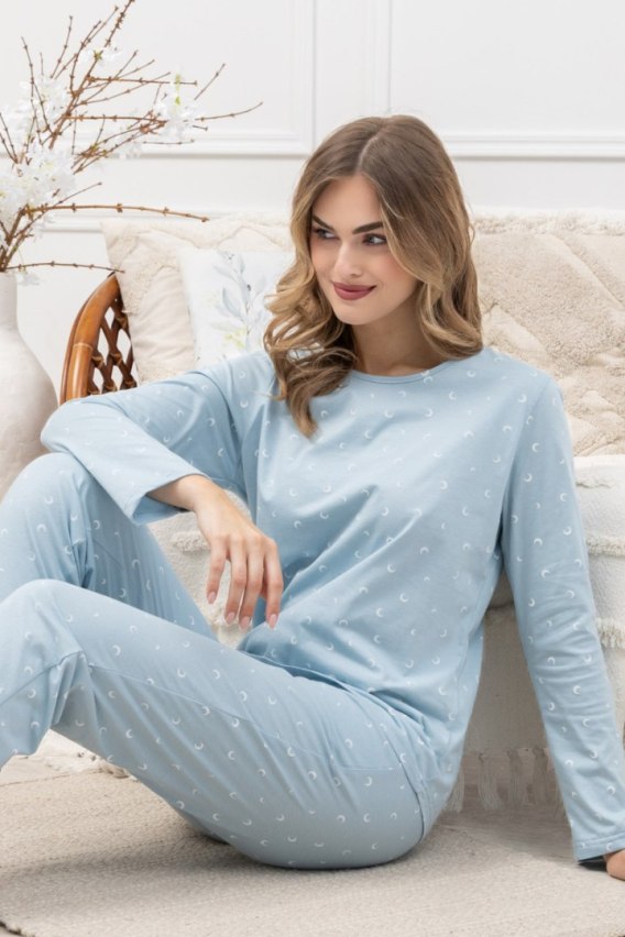 Piżama damska MARTA 1646 marki LEVEZA to połączenie komfortu, jakości i wyjątkowego designu. Wykonana w 100% z miękkiej, oddychającej bawełny, gwarantuje wygodę przez całą noc. Bluzka z okrągłym dekoltem, długimi rękawami i subtelnym wzorem nieregularnych księżyców w kolorze morski lazur nadaje całości oryginalnego charakteru. Spodnie z długą nogawką, praktycznymi kieszeniami i dekoracyjnym troczkiem w pasie zapewniają pełną swobodę ruchów. Piżama dostępna w rozmiarach S–2XL, idealna na domowy relaks i spokojny sen.