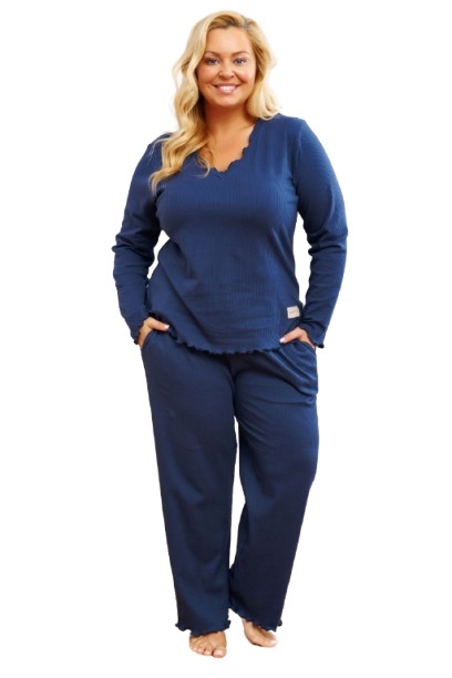 Bluzka z długim rękawem i dekoltem w serek została wykończona delikatnie falowanym brzegiem, co nadaje całości subtelnego, romantycznego wyglądu. Ten sam efekt wykorzystano przy luźnych, wygodnych spodniach, które zapewniają pełną swobodę ruchów. To idealny wybór na nocny wypoczynek, jak i na spokojne chwile w domowym zaciszu.
