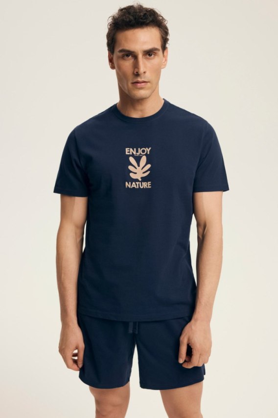 Piżama męska LEGEND 43462 AW25 to stylowe i wygodne rozwiązanie dla mężczyzn ceniących naturalne materiały i modny wygląd. Wykonana w 100% z oddychającej bawełny, zapewnia pełen komfort noszenia zarówno w nocy, jak i w domowym relaksie. T-shirt z krótkim rękawem z nadrukiem „ENJOY NATURE” oraz krótkie spodenki z elastyczną talią i sznurkiem dopasowują się do sylwetki, gwarantując swobodę ruchu. Idealna propozycja na cieplejsze noce oraz jako wygodny homewear.
