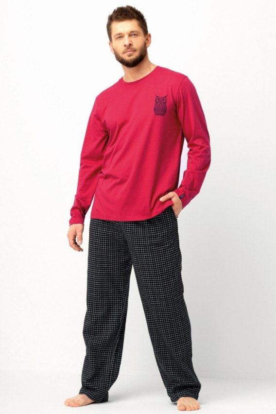 Piżama męska MNS 471 B25 to komfortowy komplet wykonany w całości z naturalnej, oddychającej bawełny. Bluza z długim rękawem i półokrągłym dekoltem została ozdobiona ciekawym nadrukiem sowy, który nadaje całości unikalnego charakteru. Spodnie uszyte z miękkiej flaneli w klasyczną kratę wyróżniają się prostym krojem nogawek oraz praktycznymi kieszeniami po bokach. Elastyczna gumka w pasie obszyta bawełną zapewnia wygodne dopasowanie i swobodę ruchów. To idealny wybór dla mężczyzn, którzy cenią naturalne materiały, praktyczność i jednocześnie odrobinę oryginalności w codziennym stroju domowym.