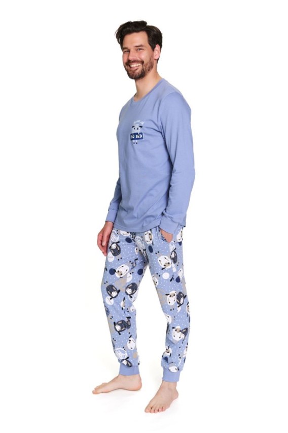 Piżama męska PMB.7347 marki Doctor Nap to propozycja łącząca komfort i nowoczesny design. Wykonana w 100% z naturalnej, oddychającej bawełny, gwarantuje miękkość, przewiewność i wygodę podczas snu oraz domowego wypoczynku. Górę kompletu stanowi błękitna koszulka z długim rękawem, ozdobiona oryginalnym nadrukiem, który nadaje całości lekkiego, casualowego charakteru. Spodnie o prostym kroju, wyposażone w praktyczne kieszenie i zakończone ściągaczami, zapewniają swobodę ruchów i idealne dopasowanie. To świetny wybór dla mężczyzn, którzy cenią sobie wygodę oraz przyjemny w dotyku, naturalny materiał.
