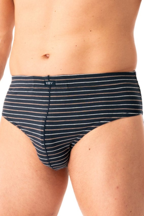 Komfortowy dwupak męskich slipów KEY w ponadczasowym paskowanym wzorze. W zestawie znajdują się dwa modele – granatowe oraz szare, oba ozdobione drobnymi, poziomymi paskami oraz dyskretnym logo marki na przodzie.