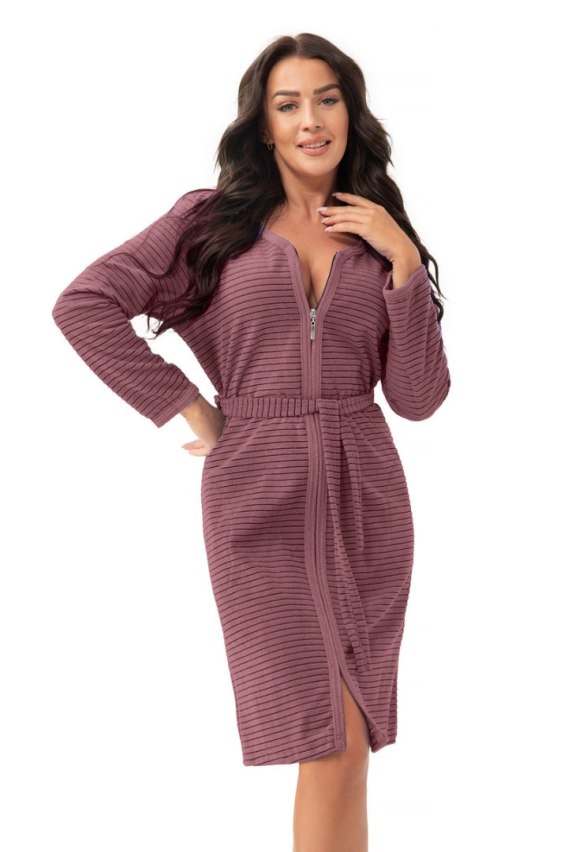 Bawełniany, damski szlafrok z długim rękawem w drobny prążek. Zapinany na suwak, dodatkowo wiązany w pasie. Na wysokosći bioder kieszenie.