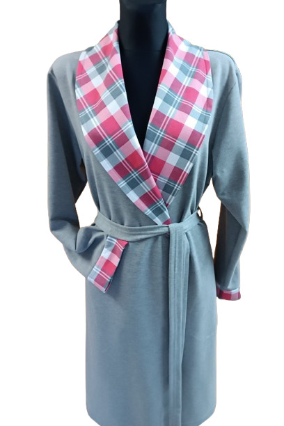 Szlafrok damski z szalowym kołnierzem uszyty z bawełny, Długi rękaw, wiązany w pasie.