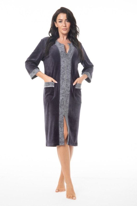 Szlafrok damski FR-404 marki Dorota to połączenie stylu, komfortu i funkcjonalności, stworzone z myślą o kobietach ceniących wygodę i elegancję w domowym wydaniu. Wykonany z przyjemnej w dotyku bawełny z dodatkiem poliestru, zapewnia odpowiednią przewiewność i miękkość, idealną na chłodne poranki i wieczory. Zamek błyskawiczny gwarantuje szybkie i wygodne zakładanie, a rękawy 3/4 oraz długość za kolano sprawiają, że model sprawdzi się przez cały rok. Dodatkowym atutem są praktyczne kieszenie na wysokości bioder. FR-404 to niezastąpiony element domowej garderoby, łączący wygodę z kobiecym fasonem.