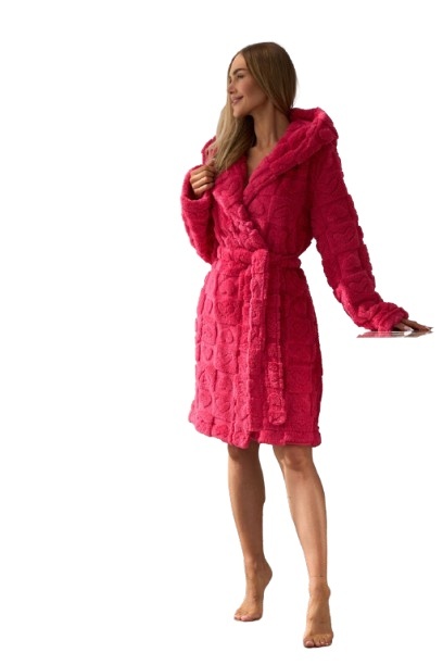 Szlafrok damski krótki L&L 2553 to połączenie funkcjonalności, wygody i romantycznego stylu. Uszyty z miękkiej, puszystej dzianiny w 100% z poliestru, przyjemnie otula ciało i zapewnia komfort termiczny. Materiał zdobi subtelny, wypukły wzór w kształcie serc, nadając mu delikatny i kobiecy charakter. Model posiada praktyczny kaptur, który chroni przed chłodem, długie rękawy oraz dwie zewnętrzne kieszenie umieszczone na wysokości bioder. Wiązanie w pasie pozwala dopasować szlafrok do sylwetki, podkreślając talię. Krótsza długość sprawia, że jest lekki i wygodny, idealny na poranki, wieczory czy po kąpieli.