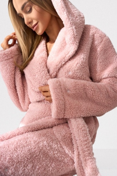 Szlafrok Damski Krótki 2559 to połączenie komfortu, ciepła i kobiecego stylu. Wykonany z wyjątkowo miękkiej, puszystej dzianiny, otula ciało delikatnością i zapewnia przyjemne ciepło po kąpieli lub podczas leniwych poranków. Posiada kaptur, który dodaje uroku i praktyczności, oraz wiązanie w pasie, pozwalające dopasować krój do sylwetki. Kieszenie umieszczone po bokach zwiększają wygodę użytkowania. Szlafrok sięga przed kolano, co nadaje mu lekkości i nowoczesnego wyglądu. Idealny na chłodne dni i wieczory.