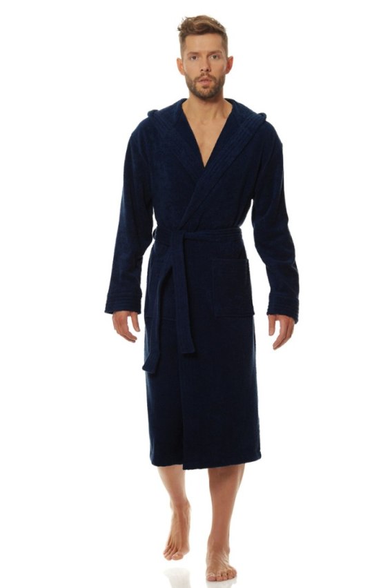 Wygodny i komfortowy męski szlafrok basenowy z kapturem, w całości wykonany z materiału tzw frotta. Wiązany w pasie, z kieszeniami.